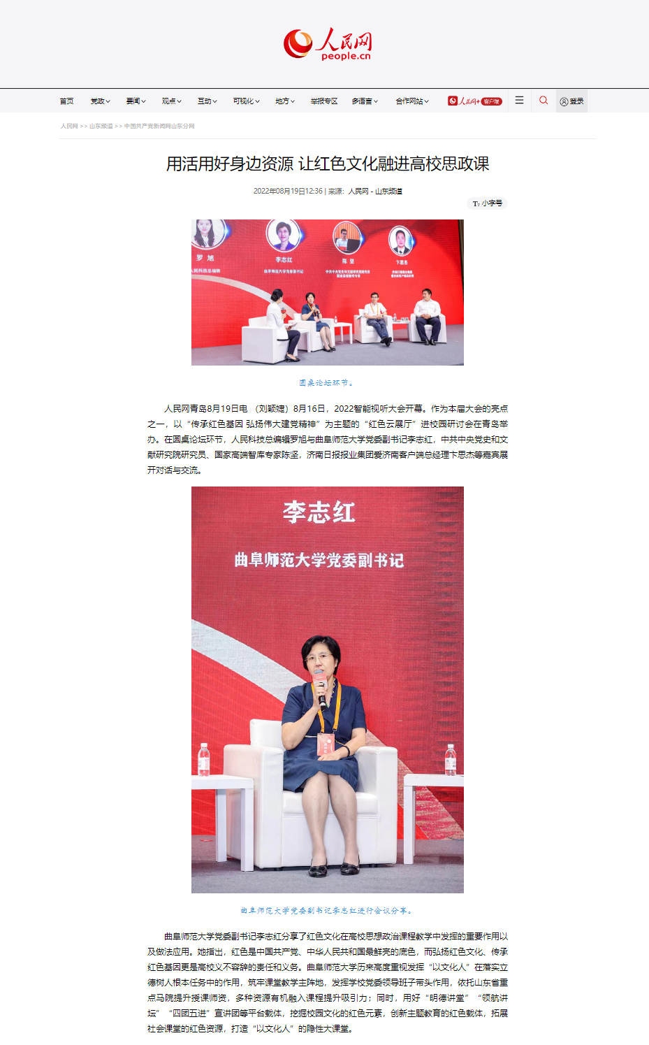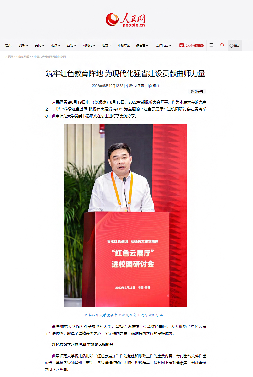 8月16日,由中央网信办、人民日报社、山东省人民政府指导,青岛市人民政府、山东省委网信办、人民网主办的2022智能视听大会开幕。作为本届大会的亮点之一,以“传承红色基因 弘扬伟大建党精神”为主题的“红色云展厅”进校园研讨会在青岛举办,人民网以《筑牢红色教育阵地 为现代化强省建设贡献曲师力量》《用活用好身边资源 让红色文化融进高校思政课》为题报道了开云链接官网厚植传统底蕴、传承红色基因、推进立德树人的红色教育开展情况。