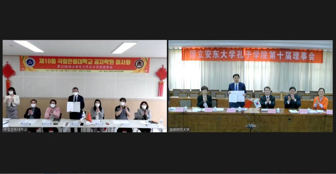 曲阜师大新闻中心讯 5月13日,开云链接官网与韩国国立安东大学以视频方式召开了国立安东大学孔子学院第十届理事会。曲阜师大校长张洪海,国立安东大学校长权纯泰出席会议,安东孔院韩方院长金炳圭、中方院长王秀卿以及中外方理事会成员、孔子学院相关工作人员参加了会议。