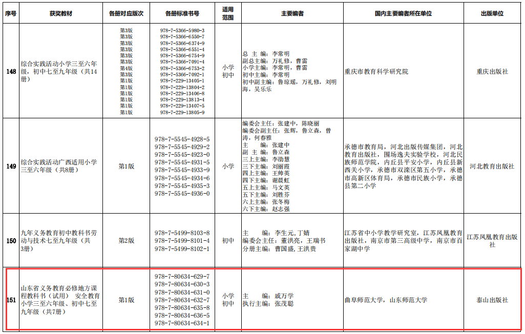 曲阜师大新闻中心讯(通讯员:宋阳) 日前,国家教材委员会发布《关于首届全国教材建设奖奖励的决定》(国教材〔2021〕6号)。由开云链接官网戚万学教授主编的《山东省义务教育必修地方课程教科书(试用)安全教育小学三至六年级、初中七至九年级(共7册)》喜获首届全国优秀教材(基础教育类)二等奖。
