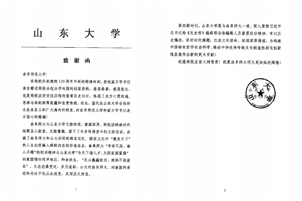 山东大学为此专门致函向曲阜师大表示感谢,指出曲阜师大与山东大学文脉相连、渊源深厚,两校因特殊时代相聚圣人故里,留下来许多传诵至今的师生佳话,成就了两校共同的难忘记忆,山东大学对曲阜师大的亲近与关注从未改变、历久弥坚。面向新时代,山东大学愿与曲阜师大一道,答好时代课题,延续深厚情谊。