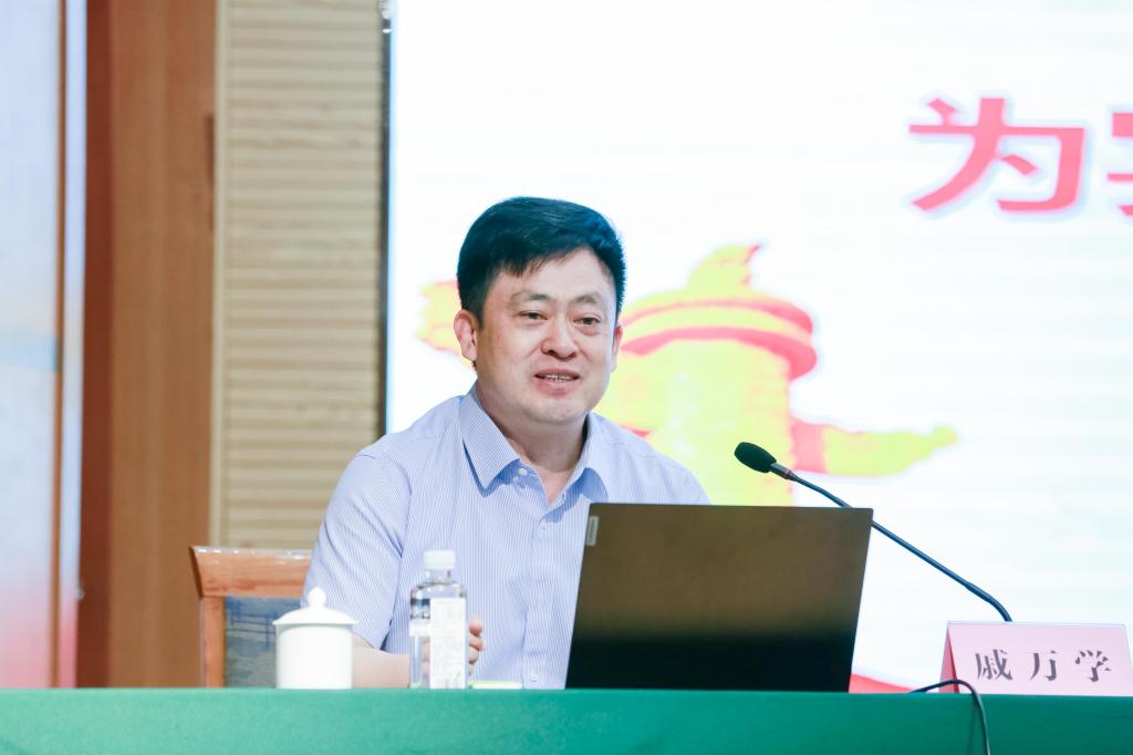 专题党课上,戚万学聚焦“中国共产党的百年奋斗史”这一主题,紧扣“现代化”这一主线,融合丰富史料、典型案例、详实数据以及理论分析,从“敢问路在何方?”、“不走‘老路’和‘邪路’”、“走有中国特色的‘新路’”三个方面,深入浅出地解读了中国在世界性的历史大潮中如何开启现代化历程并在现代化征途上一路高歌猛进,全面系统地分析了中国共产党在中国革命、建设、发展过程中的中流砥柱作用。