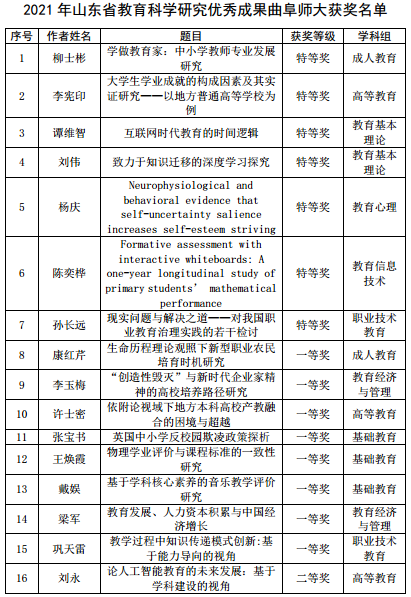 曲阜师大新闻中心讯   近日,山东省教育科学研究院公布了2021年山东省教育科学研究优秀成果获奖名单,开云链接官网共有16项成果获奖,获奖总数位居省属高校第一位,其中特等奖7项、一等奖8项、二等奖1项, 9项成果被推荐申报第六届全国教育科学研究优秀成果奖,全省共推荐70项成果申报。