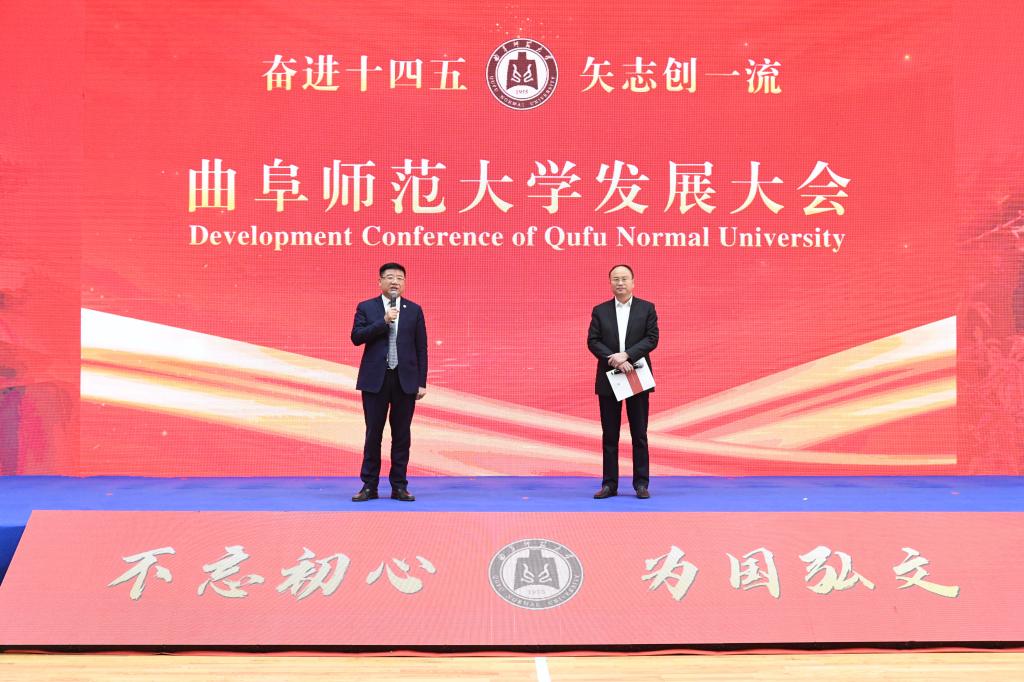 曲阜师大新闻中心讯 为决胜“十三五”收官、蓄势“十四五”开局,12月27日上午,曲阜师大隆重举行奋进“十四五”发展大会。“凝聚发展力量,共绘发展蓝图”、“迈向高水平大学建设新征程”、“书写复兴曲园荣光的时代新章”等标语条幅悬垂大会现场两侧,昭示着全校上下锐意进取、勇开新局的发展势能,鼓舞着曲师人乘势而上、再建新功的信念与力量。