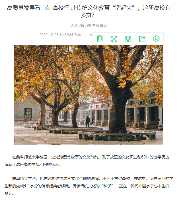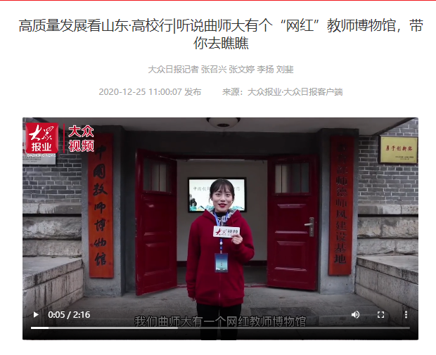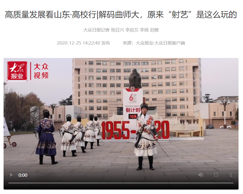 曲阜师大新闻中心讯  在收官“十三五”、开启“十四五”之际,七篇关于曲阜师大的深度报道,陆续在大众日报全媒体矩阵全网发布,“学习强国”平台转发。《会客厅·书记校长访谈录|戚万学:坚持“以文化人”,构建传统文化育人特色体系》、《高质量发展典型案例|开云链接官网:守正创新以文化人,推动人文社科领域特色科研发展》、《1+25+6000!解密曲师大“慢功夫”背后的育人密码》、《听说曲师大有个“网红”教师博物馆,带你去瞧瞧》、《让传统文化教育“活起来”,这所高校有多拼?》、《解码曲师大,原来“射艺”是这么玩的》等多篇报道,通过书记访谈、典型案例、短视频、创意海报等形式,讲述了扎根孔子故里,守正创新,坚定不移走好特色发展道路,高质量发展的曲园故事!