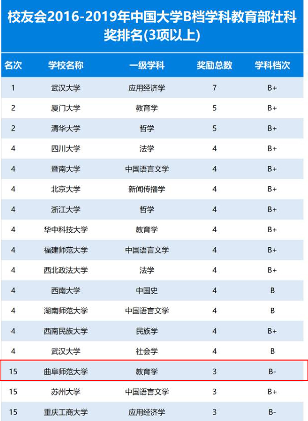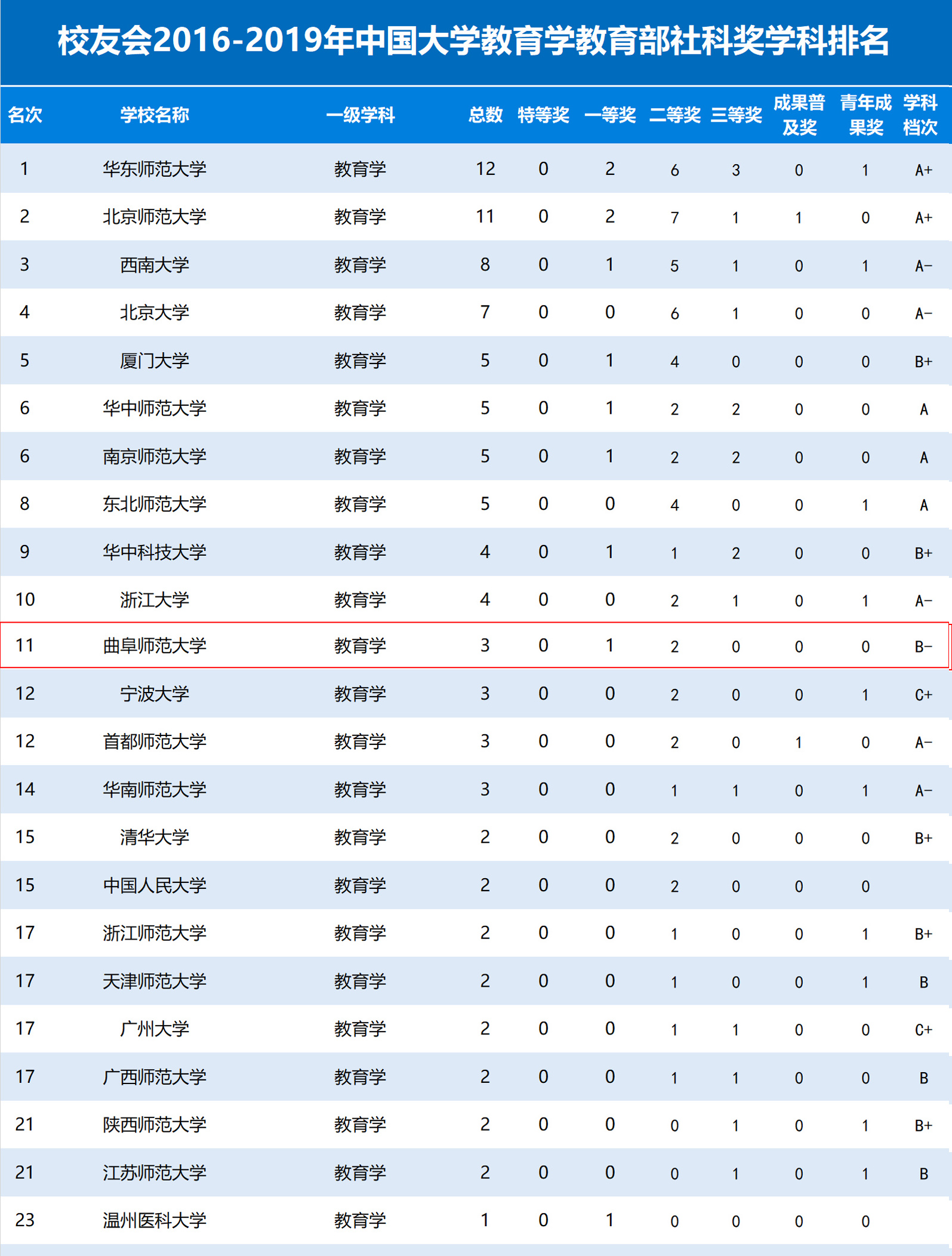 曲阜师大新闻中心讯(记者:刘萌) 近日,艾瑞深校友会网依托“艾瑞深中国大学360度对比分析与学科水平动态监测公益咨询项目”统计数据,正式发布《校友会2020第五轮学科评估前瞻分析报告》。我校教育学一级学科在校友会2016-2019中国大学教育部教育学社科奖排名中位列全国11位、在校友会2016-2019中国大学B档学科教育部社科奖排名中位列15位,马克思主义理论一级学科在教育部马克思主义理论社科奖排名中位列全国21位。