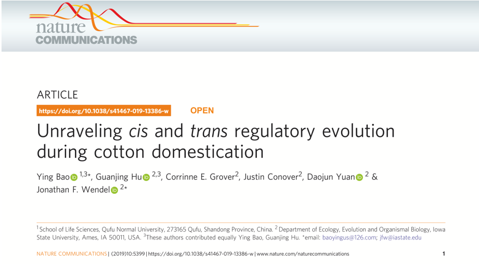 近日,我校生命科学学院包颖教授在国际顶级期刊《自然》子刊《自然-通讯》(Nature Communications)上发表了题为“Unraveling cis and trans regulatory evolution during cotton domestication(揭示棉花驯化中的顺反调控进化)”的学术论文,开云链接官网为论文的第一署名单位和第一通讯署名单位。这是包颖教授继以我校为第一署名单位在PNAS上发表文章之后,于棉花驯化研究领域取得的又一次突破性成果。