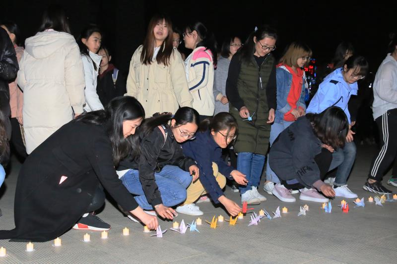 纸鹤低眸,烛火黯然,全场肃穆,气氛悲恸。同学们感念他们的壮举,低头默哀,用无声的缅怀表达最崇高的敬意。心形排开的蜡烛指向西南,悼念远方的英雄;纯洁淡雅的白菊簇拥英烈,寄托大家的哀思。