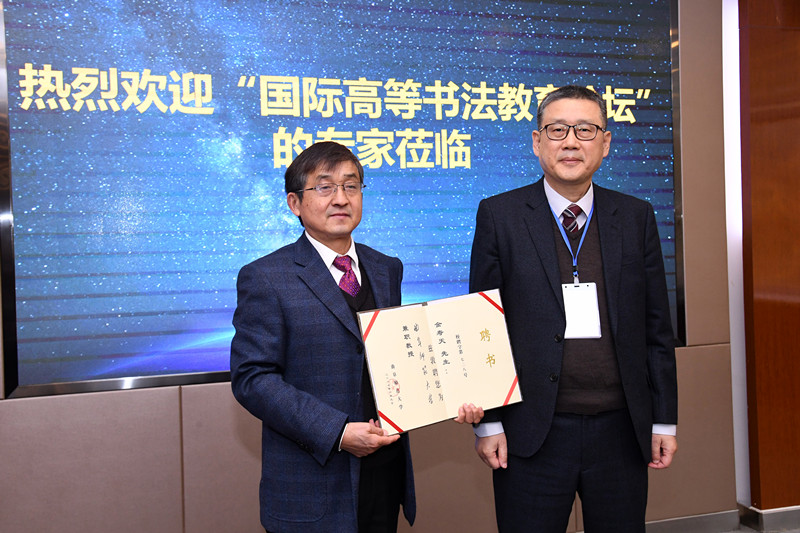会上,金寿天教授受聘为我校书法学院兼职教授,王继锁为其颁发了证书;我校书法学院党委书记姜晓强代表学校接受了秦金根捐赠的国博藏法帖《中华宝典》。