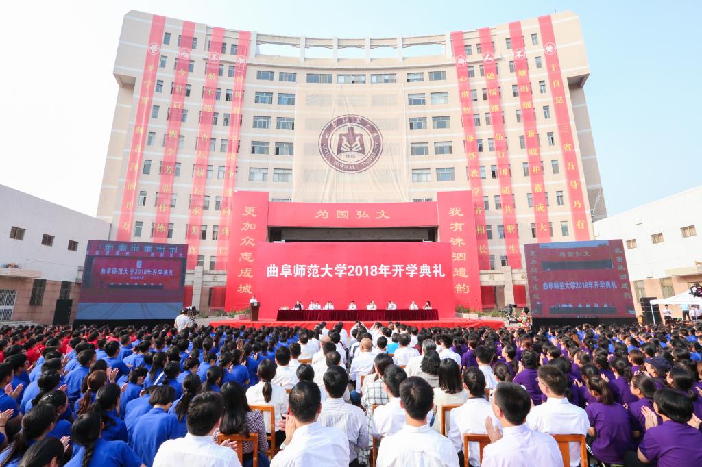 典礼在庄严的国歌声中拉开帷幕,现场隆重而热烈。由2018级新同学组成的缤纷方阵举目望去,“为国弘文”四个大字鲜艳夺目,彰显着曲园人的文化自觉与文化自信;典礼主席台两侧,“犹有洙泗遗韵,更加众志成城”——63年前首次开学典礼上的“创校宣言”,以历史的神圣与厚重,昭示着曲园人奋进新时代、建设孔子家乡一流大学的决心与担当。