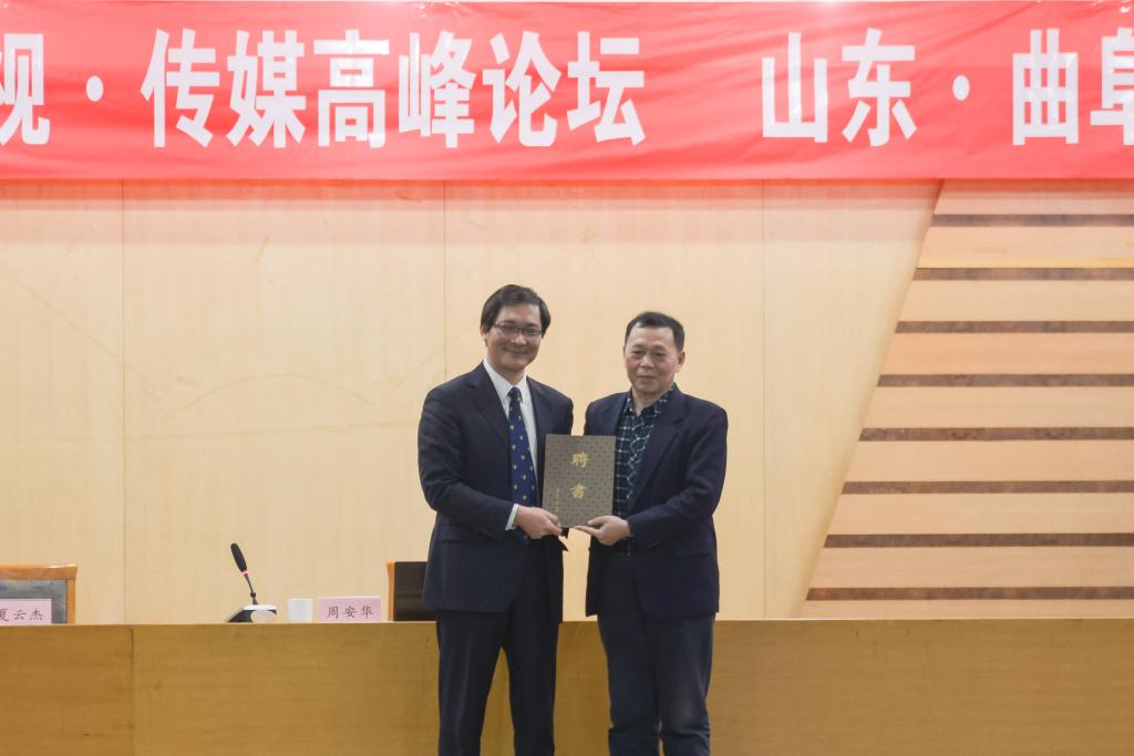 11月26日至27日,由我校传媒学院主办的“新闻·影视·传媒”高峰论坛在孔子会堂举行。全国艺术专业学位研究生教育指导委员会委员、上海大学博士生导师聂伟教授,山东广电传媒集团董事长、山东大学新闻传播学院院长吕芃教授,南京大学博士生导师周安华教授,中国戏曲学院院长、博士生导师巴图教授,应邀来我校作系列学术报告。论坛举行期间,副校长夏云杰为吕芃教授和周安华教授颁发了兼职教授聘书。传媒学院院长胡凡刚为论坛致开幕词。