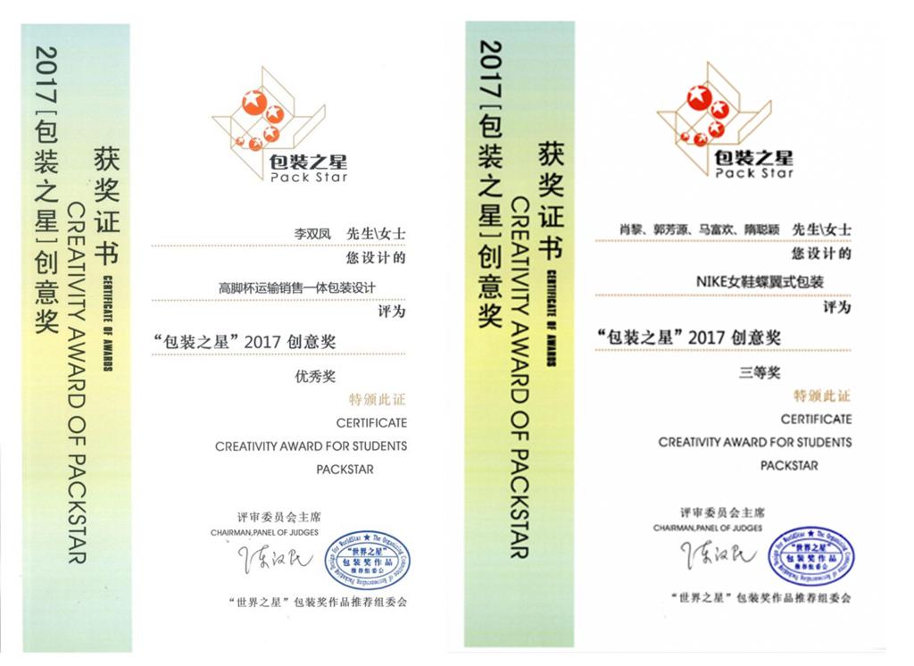 2017中国“包装之星”奖评选活动中共有27所院校报送的315件学生作品参评“包装之星”创意奖。由夏征老师指导,肖黎、郭芳源、马富欢、隋聪颖四位学子设计的作品《NIKE女鞋蝶翼式包装》荣获创意三等奖;由仲晨老师指导,李双凤同学设计的《高脚杯运输销售一体包装设计》获得创意优秀奖。中国“包装之星”奖,是世界包装组织(WPO)认可的具有推荐资格的包装设计奖项,是通向“世界之星”和“世界学生之星”国际包装设计评比活动的重要途径。获奖作品均有资格参加2017年“世界之星”WorldStar包装设计奖的申报。