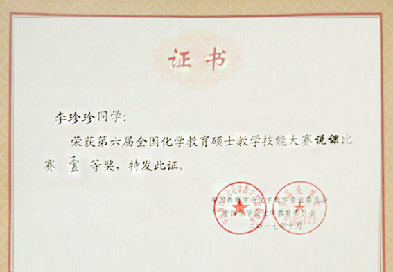 此次决赛共分4个小组进行,参赛选手要根据初赛教学设计在15分钟内完成比赛。第一部分为现场说课,主要展示“教学设计的基本思路”和“教学活动的主要环节”。第二部分为播放10分钟以内微视频,主要展示“教学中的精彩片段”。比赛过程对化学教育硕士的教学素质提出了较高的要求,我校学子荣获佳绩体现出了我校在教育硕士培养方面的突出成绩。