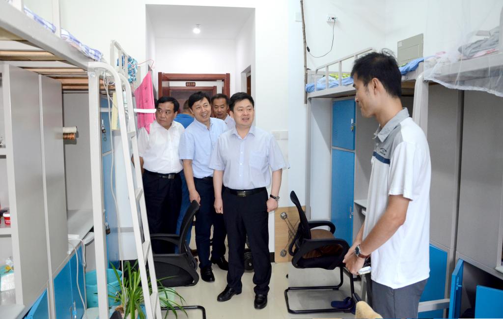 在研究生公寓,学校领导现场听取了新建研究生公寓建设及宿舍家具的安装情况汇报,详细询问了实施细节,认真查看了工程及家具安装的质量,并就后续配套设施安排进行了现场指导。