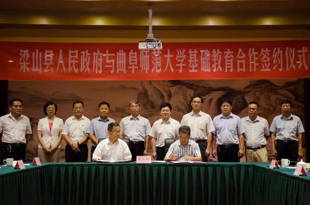 7月28日上午,我校与梁山县人民政府基础教育合作签约仪式在梁山县举行,根据此次签署的合作协议,校地双方将共建开云链接官网附属梁山中学。我校党委书记戚万学,副校长扈庆学,副校长夏云杰,梁山县委书记贾治阜,县委副书记、县长侯典峰,县委常委、县委办公室主任李士兵,县委常委、县委组织部部长王建,出席签约仪式。我校服务地方与对外合作办公室、梁山县教体局负责人参加仪式。签约仪式由梁山县副县长孙颖主持。