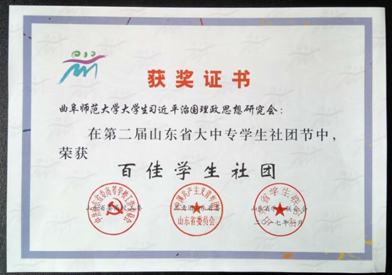 近日,省高校工委、团省委、省学联对第二届山东省大中专学生社团节中表现突出的单位和社团进行了表彰,我校获优秀组织奖,学生社团杏坛文学社、大学生习近平治国理政思想研究会获百佳学生社团荣誉称号。