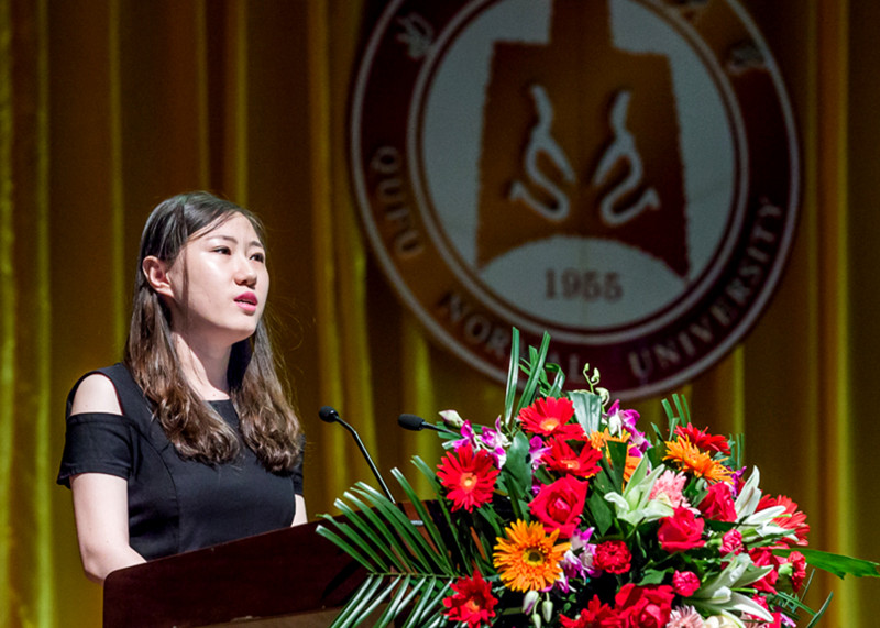 校长戚万学在典礼上致辞。戚万学代表学校向圆满完成学业的毕业生表示热烈祝贺,向为同学们的成长付出心血的老师、家长及社会各界表达最诚挚的谢意和敬意。面对即将扬帆起航的学子,他饱含深情地说:毕业了,你们有理由庆贺,因为四年来你们不断突破自己,终于破茧成蝶。大学的青春,将定格在这里;曲园的情怀,将牵起你们与这所大学一生相连,一直烙印和珍藏心间。戚万学说,六十余载砥砺耕耘,赢得万千芬芳,曲阜师大从未放弃对文化薪火相传的承诺,并以特有的品质与追求书写了孔子家乡兴教育人的“杏坛新篇”。曲园见证了同学们的努力与成长,同学们对曲园传统和精神的承当,终将使这所大学非同凡响。在新的一页即将翻开之际,戚万学以一名师者、长者的身份期盼同学们,做事时多点耐心,从容执着,因为坚持、坚守、从容较之折腾、闹腾、焦躁更要紧,更有意义;处世时守住良心,多点真诚,在变革的时代守护公义、懂得奉献绵薄、尊重他人、服务社会,不辜负自己、不辜负这个时代。戚万学最后寄语毕业生“世界很大、很精彩,背起行囊,送你出发。良心、耐心、责任、坚韧,将永远照亮你回家的路。累了,想了,静轩西路57号,等你回家!”