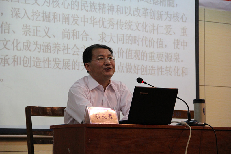 9月13日下午,地理与旅游学院党总支书记胡长春为学生干部培训班作了第二场报告:《中国文化精神与青年人格修养》,报告由学生工作办公室副主任徐正伟主持。胡长春首先谈了学习习近平总书记关于中国传统文化重要论述的体会,阐述了中国传统文化精神的基本内涵以及对中华民族发展的内在精神凝聚和价值取向的引领作用,突出强调了中国传统文化的重要性。整场报告围绕中国文化精神展开,以孔孟之学、道家思想以及夏、商、周时期的经典人物,对中华民族的主要精神内涵《易经》中的“自强不息”和“厚德载物”进行详细解读。对于大学生的人格修养问题,胡长春分析了中国传统理想人格与道德修养的理论基础及实践体系,并结合实际,阐述了当代青年学生借鉴传统道德修养资源,在树立责任担当、励志修身以及正确处理人际关系等方面给出建议,对于青年学生健全人格、提高道德修养具有积极的指导意义。整场报告旁征博引、深入浅出,气氛热烈,赢得阵阵掌声。最后,徐正伟对报告做了简短总结并希望学生干部们能够做到有担当、有素质、有气质,认真践行社会主义核心价值观,为实现中国梦而努力。