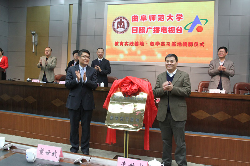 3月31日上午,我校在日照电视台设立教育实践基地和教学实习基地,揭牌仪式在日照电视台二楼会议室举行。我校纪委书记郭辰夫,日照广播电视台台长、日照广播影视集团董事长孙正武,日照电视台党委副书记、总编辑赵勇出席了揭牌仪式。我校研究生处、教务处、信息技术与传播学院以及日照电视台各部门负责人,和我校信息技术与传播学院广播电视专业研究生导师,新闻学、广告学专业教师代表,赴日照广播电视台实习的21名2012级硕士研究生参加了揭牌仪式。