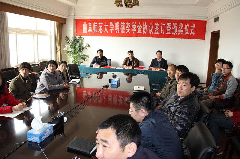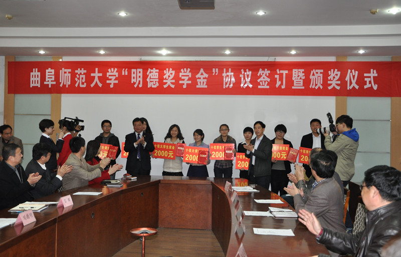 3月18日上午,“明德奖学金”协议签订暨颁奖仪式在我校举行。党委书记荆兆勋、党委副书记孙文亮、纪委书记郭辰夫,山东明德物业管理集团董事长刘德明出席了仪式,学校办公室、宣传部、学生工作处、团委、日照校区管理办公室和校区学生工作办公室等单位负责人及各学院师生代表参加仪式。