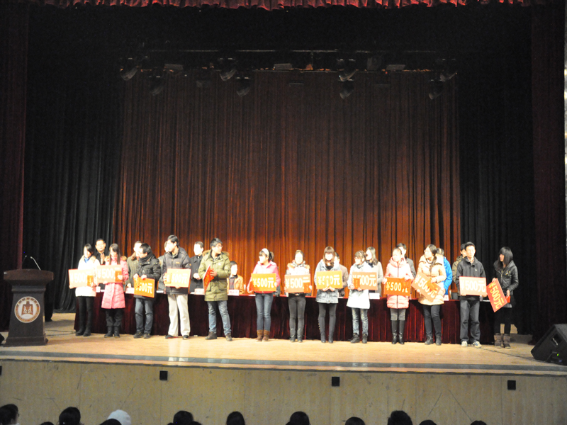在欢乐的乐曲声中,获奖同学代表依次走到主席台前,从颁奖嘉宾手中接过学院奖励的奖金牌匾和获奖证书。