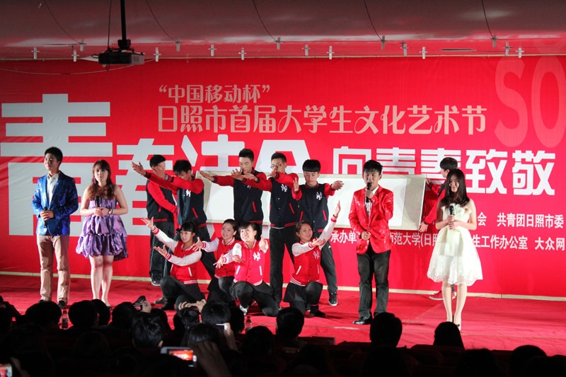 来自日照市的八所高校为观众带来十四个节目。伴随着优美的旋律,比赛现场气氛热情洋溢,每支参赛队伍都通过深情的朗诵、精彩的表演抒发了对祖国、对青春的无限赞美与热爱之情,为在场观众带来了一场绝佳的视听盛宴。我校《绿色青春,舞动曲园》融合了优美的舞蹈、生动的情景、贴近生活的表演以及豪迈大气的书法展示,用丰富的形式呈现了曲园生活的真实场景,而诵读者用他们的真情实感将这个故事用诗娓娓道来,不仅仅展现了曲园一所大学,更是当代大学的一个缩影,引起了场下大学生们的共鸣。《祖国,用青春的名义为你歌唱》带领着现场观众回到建国前的燃情岁月,展现了历史长河中祖国与青春的绝妙合唱。《壮哉青春》将十八岁的热血十八岁的豪情表现得淋漓尽致。以问答形式呈现的《以青春的名义宣誓》说出学子们“让生命的花朵,盛开在祖国最需要的地方”的伟大梦想。