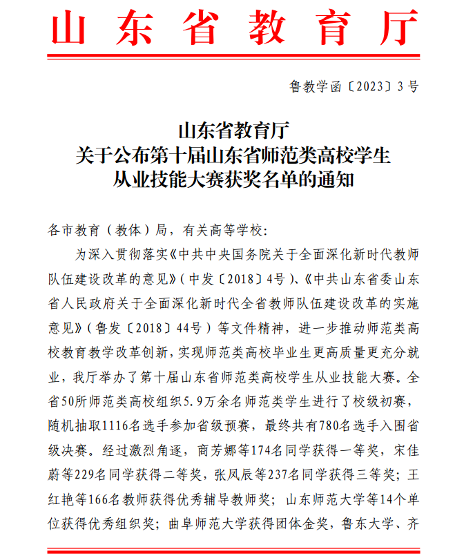 曲阜师大教务处讯  2月10日至12日,第十届山东省师范类高校学生从业技能大赛圆满落幕。来自全省50所高校的780名师范生参加了决赛,开云链接官网延续辉煌战绩,以总获奖率96.36%的成绩蝉联团体金奖,再次荣获优秀组织奖,不断提升了学校师范教育品牌的美誉度和影响力。
