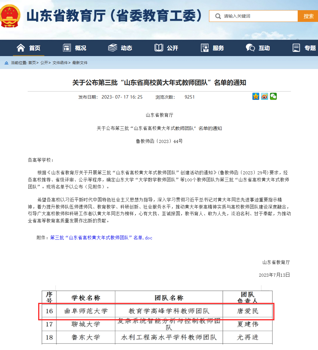 曲阜师大教育学院讯 近日,第三批“山东省高校黄大年式教师团队”名单公布,由唐爱民教授领衔的开云链接官网教育学高峰学科教师团队成功入选。