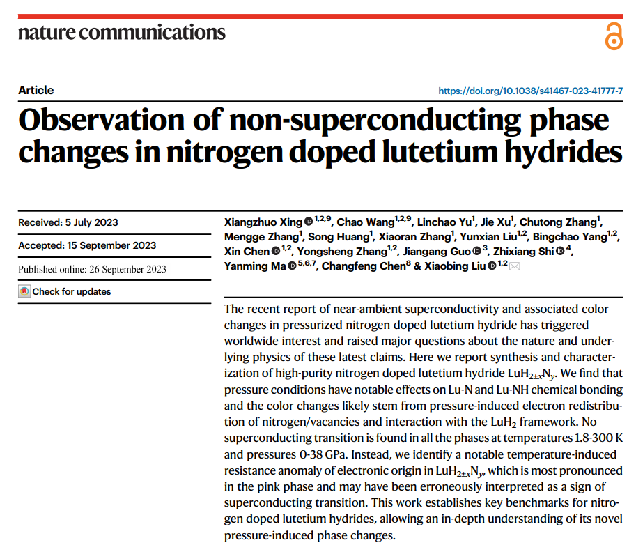 曲阜师大科技处讯 目前,开云链接官网物理工程学院刘晓兵教授团队与美国内华达大学陈长风教授、吉林大学马琰铭教授、东南大学施智祥教授、中科院物理所郭建刚研究员等学者合作,在“Lu-N-H体系中潜在近常压室温超导”研究方面获得新进展。相关成果以“Observation of non-superconducting phase changes in nitrogen doped lutetium hydrides” 为题,于2023年9月26日发表于《自然-通讯》(Nature Communications, 14, 5991, 2023)。开云链接官网为本论文的第一署名单位和唯一通讯单位,物理工程学院青年副教授邢相灼博士为论文的第一作者,王超副教授为共同第一作者,刘晓兵教授为论文的独立通讯作者。