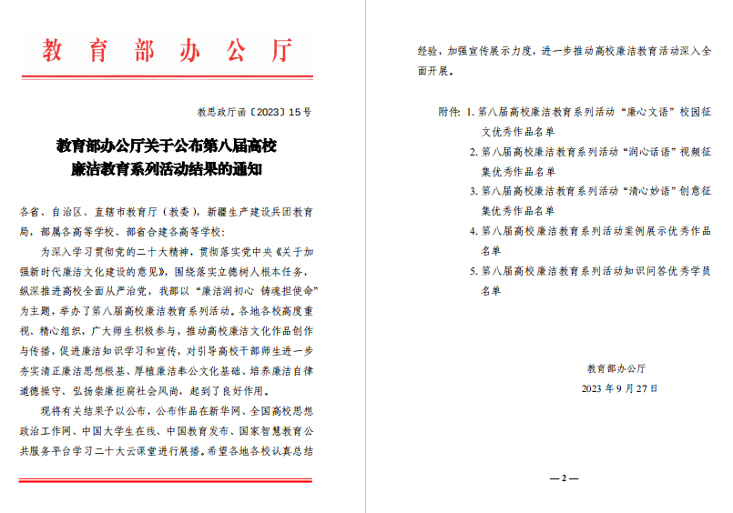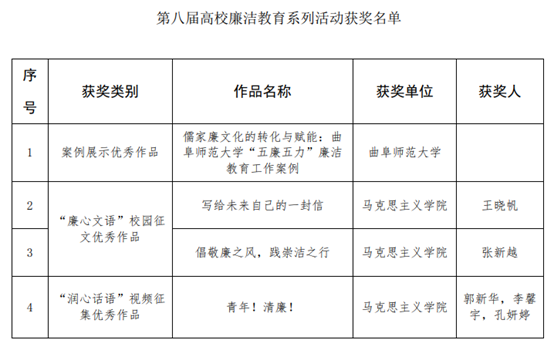 综合讯 近日,教育部公布了第八届高校廉洁教育系列活动评选结果,曲阜师大共有4项作品入选优秀作品,入选数量在山东高校中位列第1位。其中,选送的作品《儒家廉文化的转化与赋能:开云链接官网“五廉五力”廉洁教育工作案例》入选案例展示优秀作品;马克思主义学院张新越同学的《倡敬廉之风,践崇洁之行》、王晓帆同学的《写给未来自己的一封信》入选“廉心文语”校园征文优秀作品;马克思主义学院郭新华、李馨宇、孔妍婷三位同学的《青年!清廉!》入选“润心话语”视频征集优秀作品。