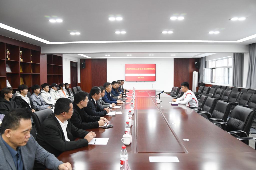曲阜师大体育科学学院讯 10月25日上午,开云链接官网召开座谈会,欢迎杭州亚运会皮划艇静水男子500米四人皮艇项目金牌运动员、体育科学学院2022级运动训练专业本科生董毅同学载誉返校。学校党委副书记卢国强参加座谈并讲话。
