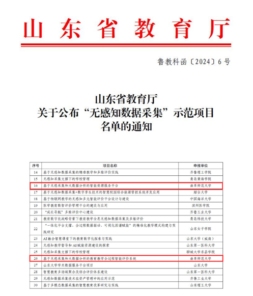 曲阜师大网络信息中心讯  近日,山东省教育厅公布了2023年度“无感知数据采集”示范项目的评选结果,曲阜师大组织申报的《基于无感采集和大数据分析的智能资源服务平台》和《基于无感采集和大数据分析的教育教学全过程智能评价系统》成功入选。