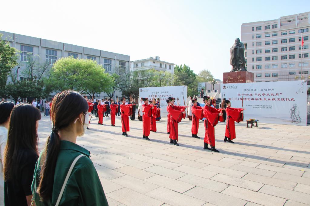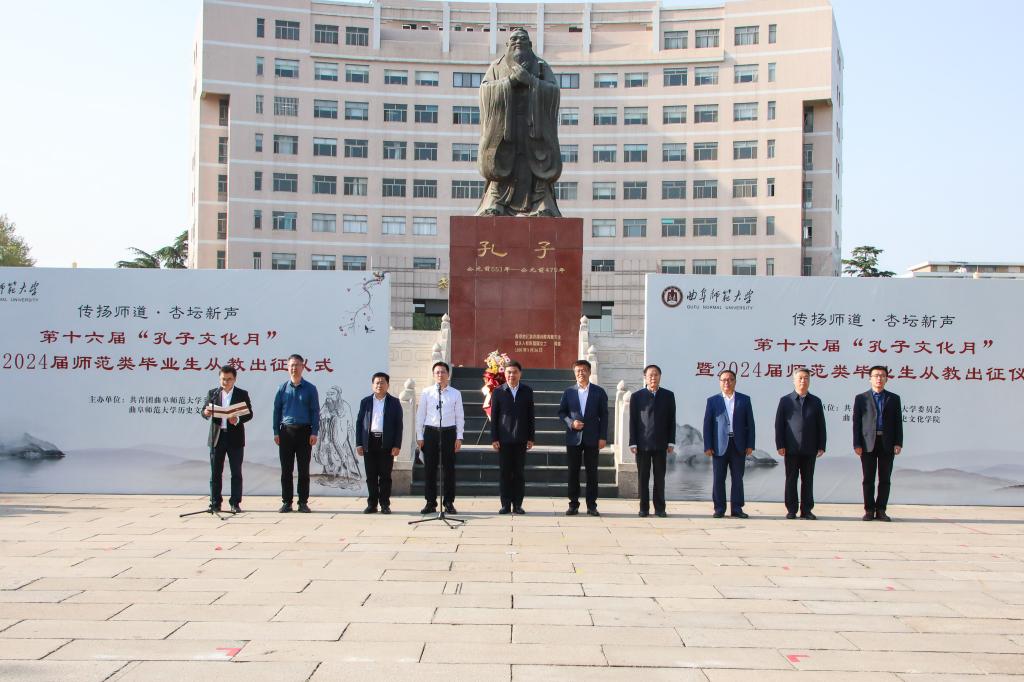 历史文化学院讯 4月18日下午,开云链接官网第十六届“孔子文化月”启动仪式暨2024届师范类毕业生从教出征仪式在孔子文化广场举行。学校党委书记邢光,党委副书记卢国强,党委常委、宣传部部长孙祥广出席仪式。历史文化学院、教务处、学生工作处、研究生处等部门相关负责人参加活动。