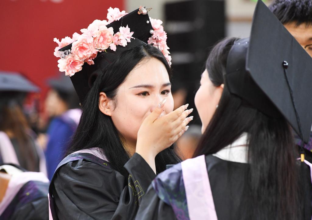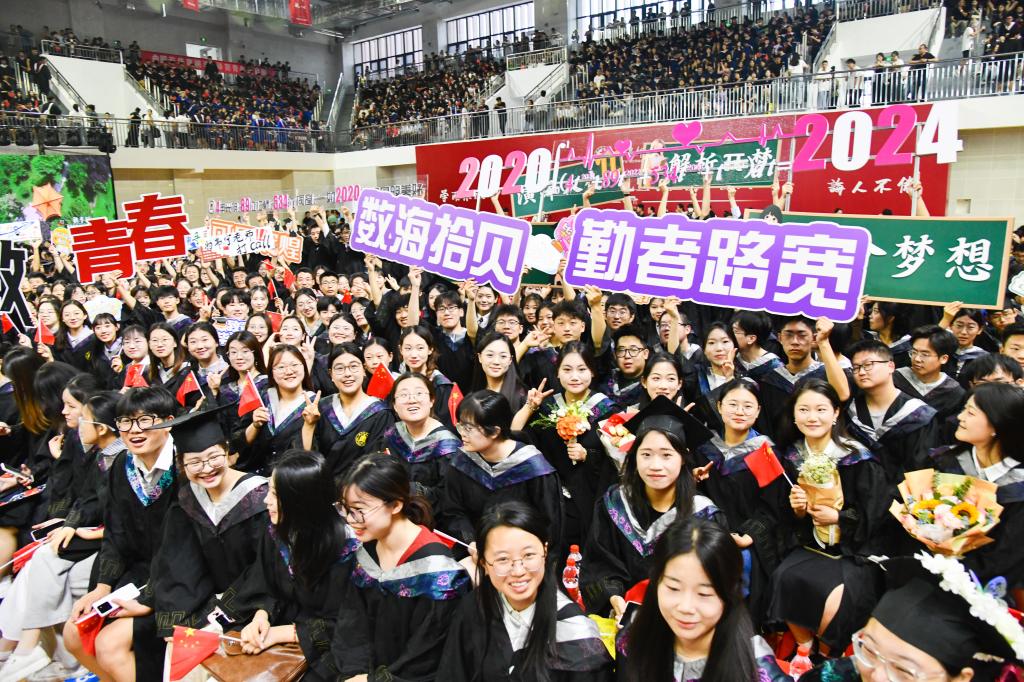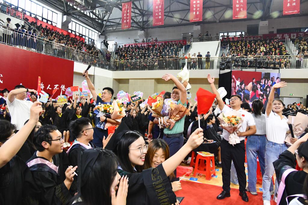 灿烂笑容、热情拥抱、激动落泪、尽情欢呼……典礼上,博士妈妈身着学位服手牵萌娃定格温馨毕业照,退役复学大学生现场秒换军装向老师们庄重敬礼燃动全场,儿子为爸爸穿上学位服送出别样父亲节礼物……毕业学子们秀出花样风采纪念自己的荣耀时刻,留下美好青春记忆。