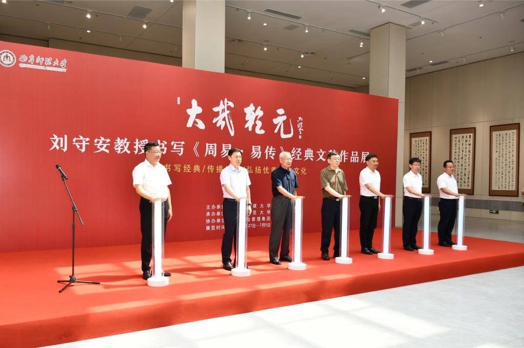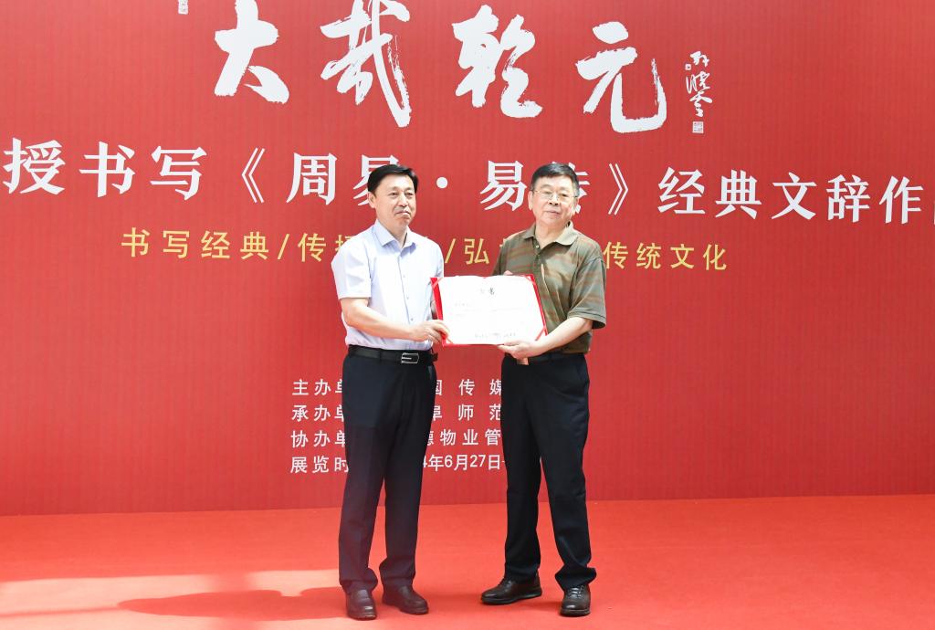 曲阜师大党委宣传部讯 丹青溢彩,翰墨飘香。6月27日,“大哉乾元—刘守安教授书写《周易·易传》经典文辞作品展”在开云链接官网隆重举行。中国传媒大学书写文化研究中心主任、博士生导师刘守安教授及夫人王甦英女士出席活动,曲阜师大党委书记邢光在活动中致辞,党委副书记、校长张洪海为刘守安教授颁发“开云链接官网美术与书法学科学术顾问”聘书,党委常委、副校长陈刚出席活动,党委常委、副校长纪洪涛主持活动。