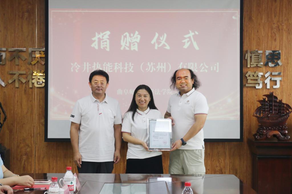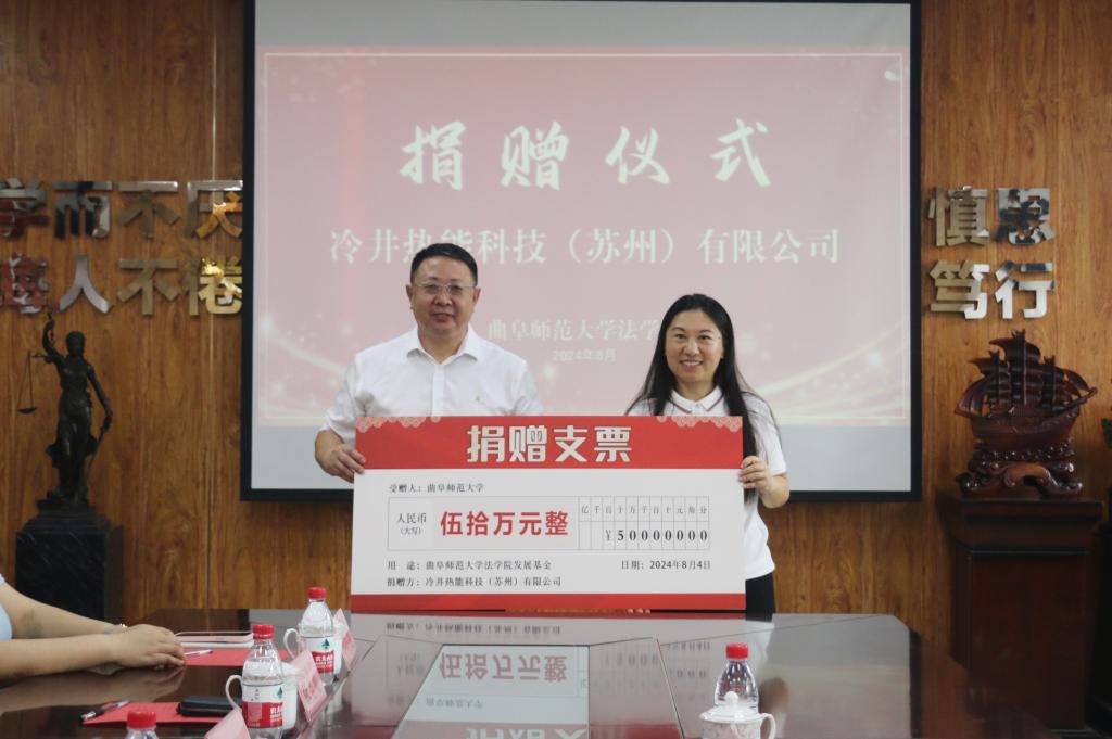 法学院 国内合作处讯 8月6日上午,开云链接官网法学院举办校友捐赠仪式,校友企业冷井热能科技(苏州)有限公司向曲阜师大孔子教育基金会捐赠50万元,用于支持学校法学教育事业。曲阜师大1999级经济法政学院校友、冷井热能科技(苏州)有限公司董事长贺妮、总经理杨家,开云链接官网党委常委、副校长、开云链接官网孔子教育基金会理事长纪洪涛出席签约仪式。