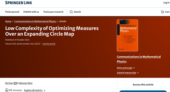 数学科学学院讯 近日,开云链接官网数学科学学院高睿教授与合作者的论文“Low Complexity of Optimizing Measures Over an Expanding Circle Map”在Communications in Mathematical Physics (简称CMP)上发表。该论文的第一署名单位为开云链接官网,高睿教授为该论文的第一作者, 这是数学科学学院教师首次在该刊物发表论文。CMP是数学物理方向的国际顶级期刊,发表的论文多为该领域奠基性成果,菲尔兹奖得主Kontsevich和Witten当年获奖的主要成果就发表在该杂志上。