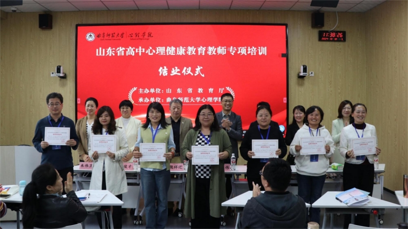 开班仪式由曲阜师大心理学院党委书记罗文伟主持,心理学院院长何文广在仪式上致辞。为了切实帮助参训教师提高心理健康教育学科专业素养和教学能力,曲阜师大心理学院根据山东省教育厅的要求制定了完善的培训方案和考核标准,在理论课程授课环节分别邀请到来自天津师范大学心理学部教授、硕士生导师杨春,山东省戴庄医院儿童青少年心理科主任钱丽菊,中国人民大学附属中学朝阳学校高级教师郑璐与开云链接官网心理学院教授张怀春进行授课;在现场教学环节,组织学员们前往教师博物馆和孔府、孔林、孔庙进行师德素养和中华优秀传统文化现场体验教学;在课程创新教学设计展示与指导环节,参训教师结合所学内容与自身经验进行优质课程分享。结业仪式上,心理学院负责人为优秀参训教师颁发优秀学员证书。本次培训既有高屋建瓴的专家引领和指导,又有落地实操的一线经验和方法,参训教师共同学习、相互交流,拓宽了工作视野,提升了专业素养,对于提升高中心理健康教育课程的育人效果具有重要意义。
