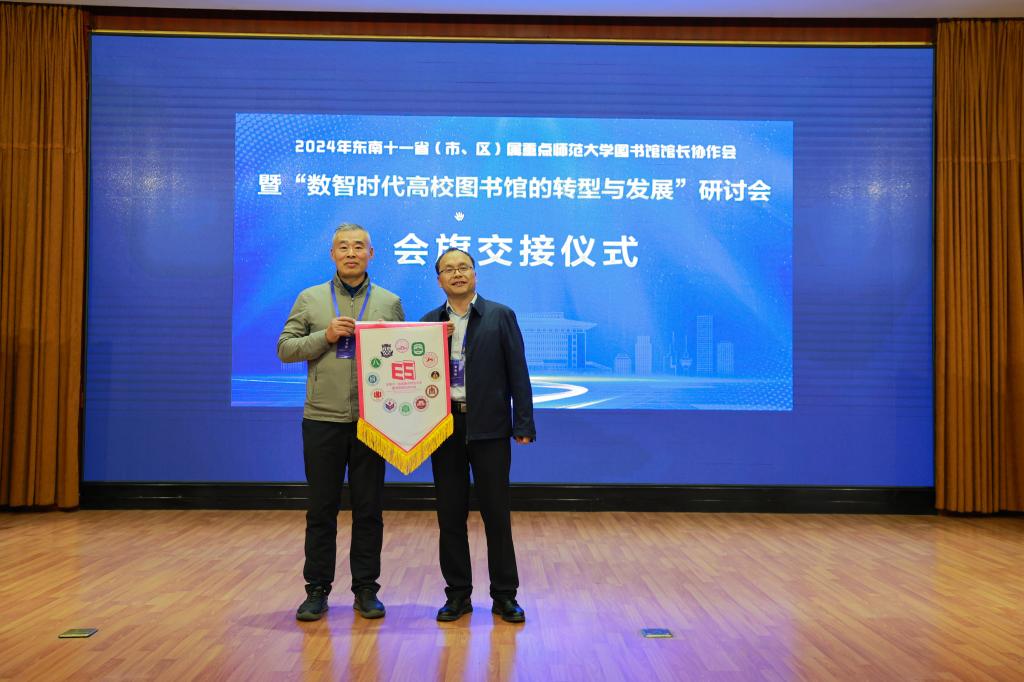 开云链接官网图书馆馆长王东波将会旗传递给下一届承办单位上海师范大学图书馆党委书记曹鹏。
