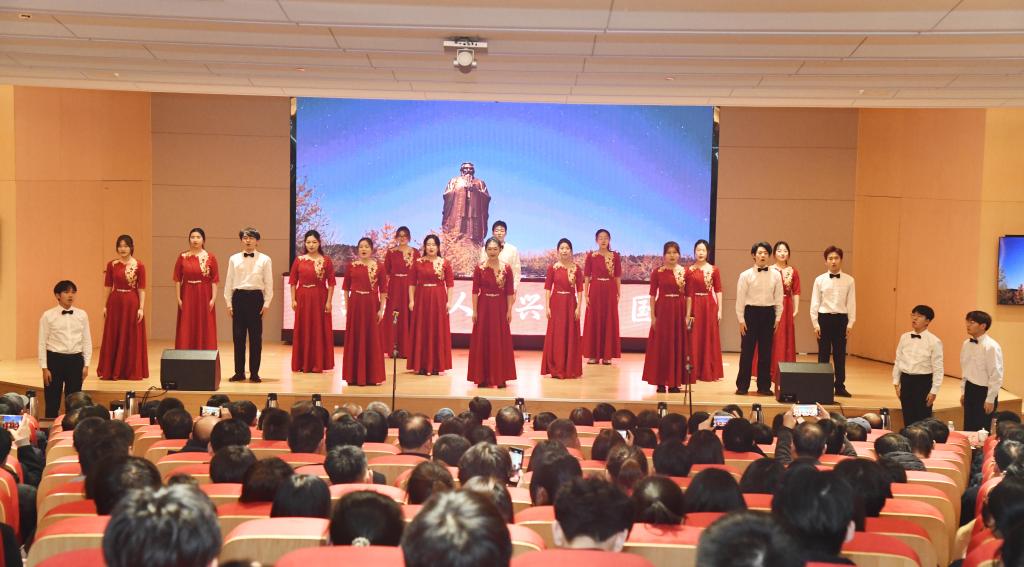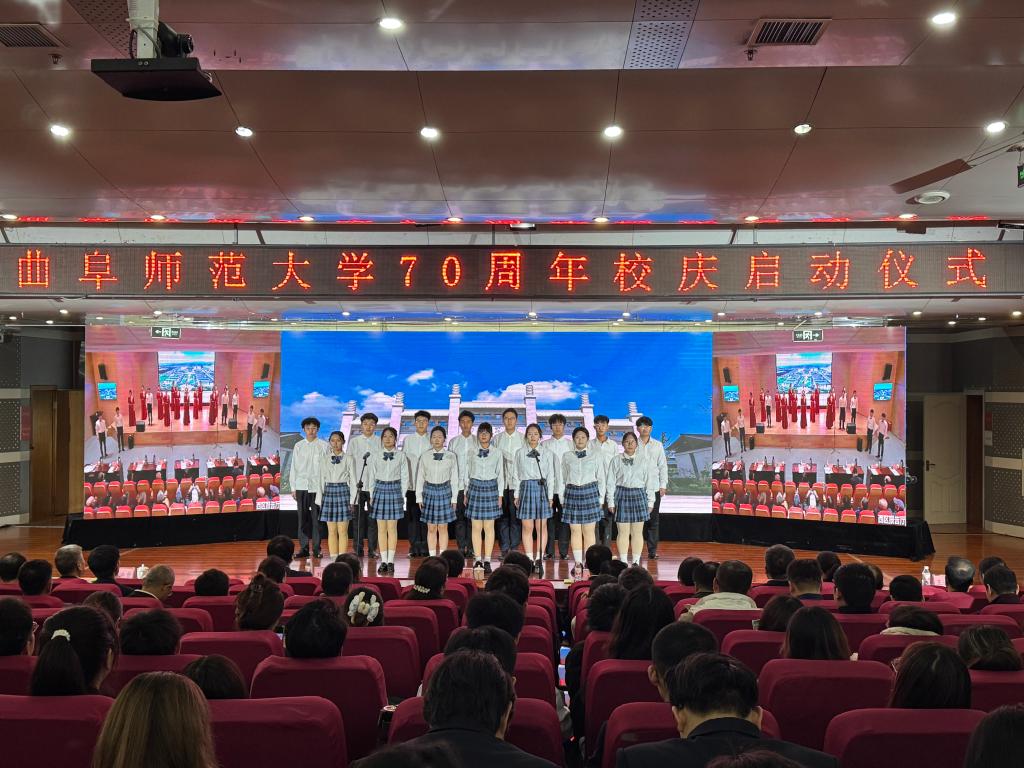 仪式上,张洪海、李志红、傅永聚、刘德明、刘晓兵、谢依瞳在曲阜校区会场,胡凡刚、刘刚、王海峰、郭洪贵、徐健腾、王滋润在日照校区会场共同发布了校庆主题——“弘文育人,兴学报国”。