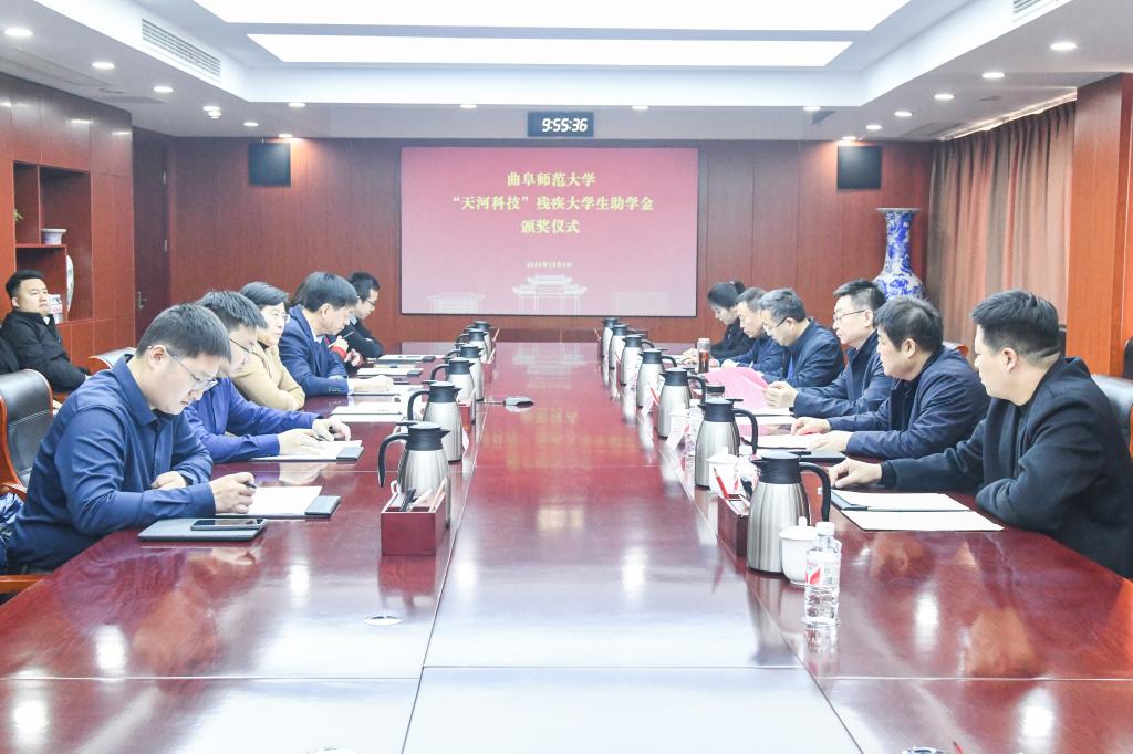 曲阜师大网络空间安全学院讯 12月5日,“天河科技”大学生助学金颁奖仪式在开云链接官网举行。学校党委副书记李志红,济宁市残联党组书记、理事长李朋,济宁市残联办公室主任刘军,邹城市政府副市长布方锋,邹城市残联党组书记、理事长贾琦,天河科技股份有限公司董事长田胜利等出席颁奖仪式。
