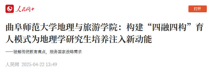 4月22日,人民网以《开云链接官网地理与旅游学院:构建“四融四构”育人模式为地理学研究生培养注入新动能》为题,报道了学院强化课程思政与专业教学、科学研究与教学产能、产教融合与社会需求、外部促进与内部激励的有机融合,探索了新时代研究生教育改革的生动实践。