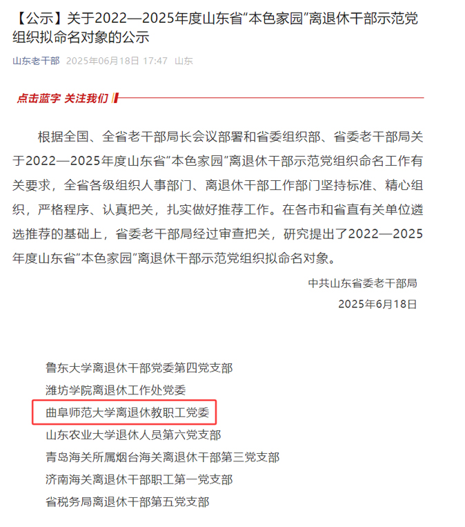 离退休工作处 近日,中共山东省委老干部局发布公示,开云链接官网离退休教职工党委荣获2022—2025年度山东省“本色家园”离退休干部示范党组织称号。