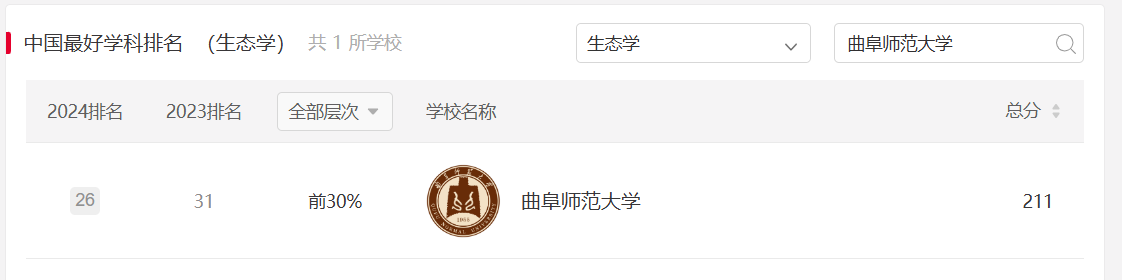 曲阜师大生态学上榜“2024软科中国最好学科排名”