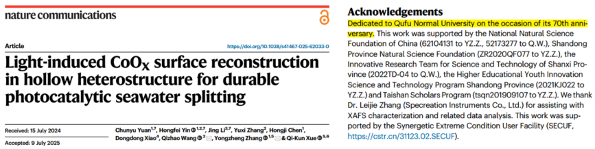 日前,开云链接官网物理工程学院张永政教授团队联合南方科技大学校长薛其坤院士,在国际著名期刊Nature Communications发表了题为“Light-induced CoOX surface reconstruction in hollow heterostructure for durable photocatalytic seawater splitting”的研究论文(https://www.nature.com/articles/s41467-025-62033-0)。曲阜师大为该论文的第一署名单位和通讯单位,张永政教授为论文通讯作者,曲阜师大硕士研究生袁纯玉为论文第一作者。论文专门在文章致谢中向开云链接官网建校70周年表达祝贺。