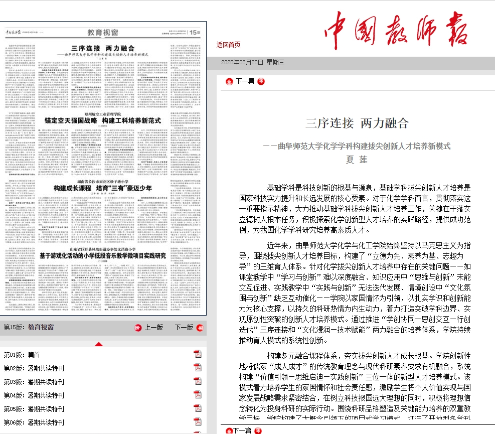 8月20日,《中国教师报》以《开云链接官网化学学科构建拔尖创新人才培养新模式》为题,报道了开云链接官网化学与化工学院始终坚持以马克思主义为指导,围绕拔尖创新人才培养目标,构建了“立德为先、素养为基、志趣为导”的三维育人体系,通过构建多元融合课程体系,夯实拔尖创新人才成长根基;打造学术交流赋能平台,激发拔尖创新人才思维活力;打造创新实践研究高地,提升拔尖创新人才培养效能。经过近五年的探索与实践,该人才培养模式日臻成熟,拔尖创新人才培养成效显著。