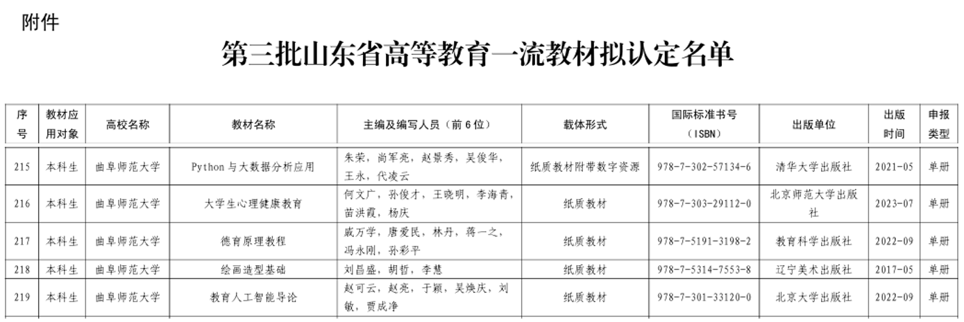 教务处讯  日前,山东省教材委员会办公室公布第三批山东省普通高等教育一流教材名单,曲阜师大5种教材入选,分别是教育学院戚万学教授主编《德育原理教程》、心理学院何文广教授主编《大学生心理健康教育》、美术学院刘昌盛教授主编《绘画造型基础》传媒学院赵可云教授主编《教育人工智能导论》计算机学院朱荣副教授主编《Python与大数据分析应用》。