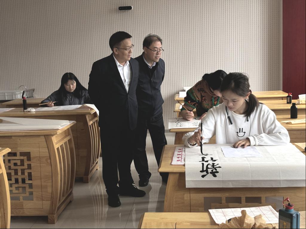 比赛期间,党委常委、副校长胡凡刚到现场观摩指导,详细了解赛事组织情况,并对参赛学生的书写技能与专注态度给予充分肯定。