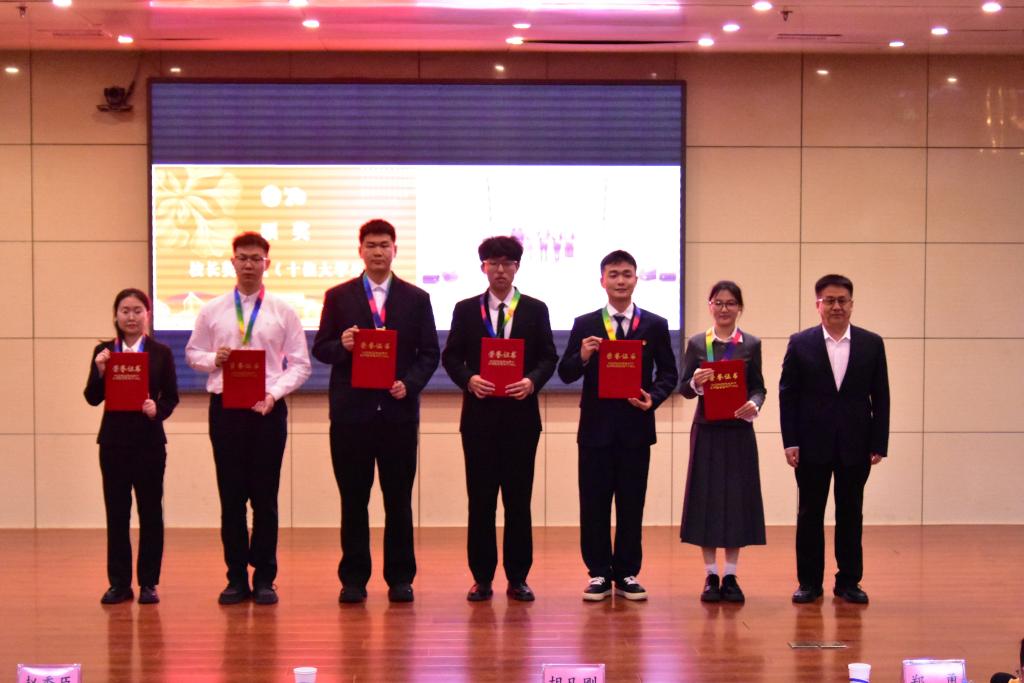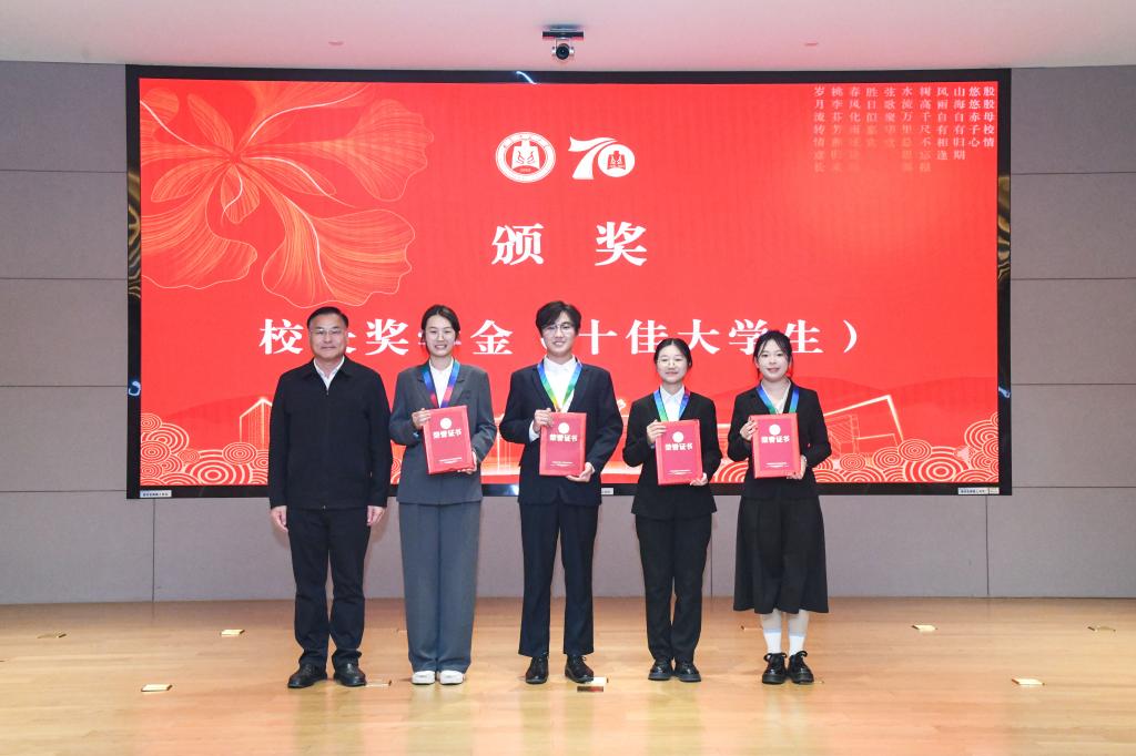 学生工作处处长姜美颖宣读2025年校长奖学金(十佳大学生)获奖名单。学生工作处班子成员和各学院党委副书记为两校区100名学生颁发了“百优大学生”证书和奖章。