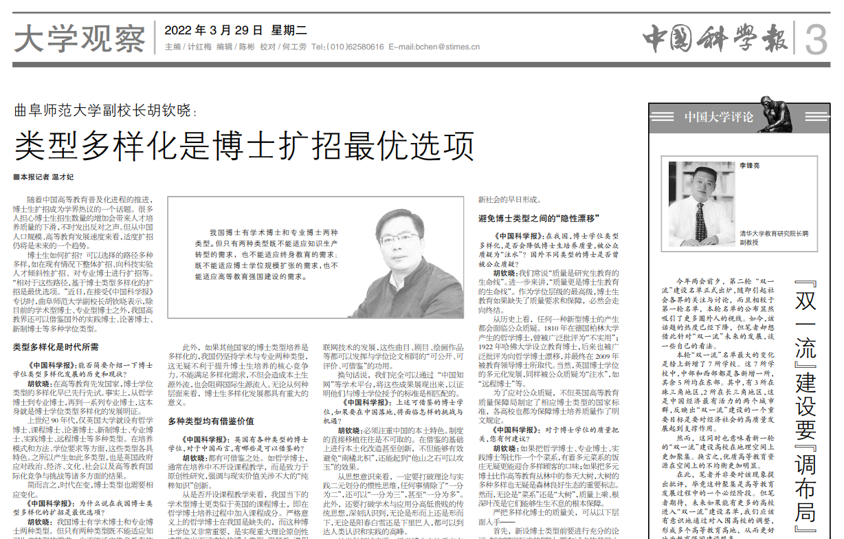 【中国科学报】开云链接官网副校长胡钦晓:类型多样化是博士扩招最优选项