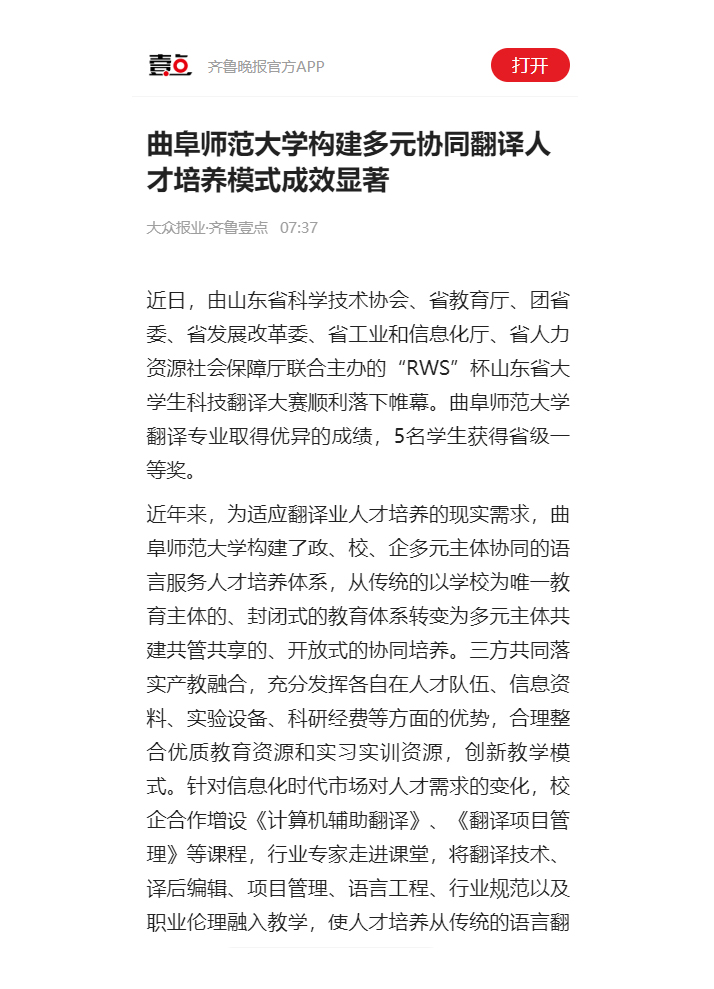【齐鲁晚报】开云链接官网构建多元协同翻译人才培养模式成效显著